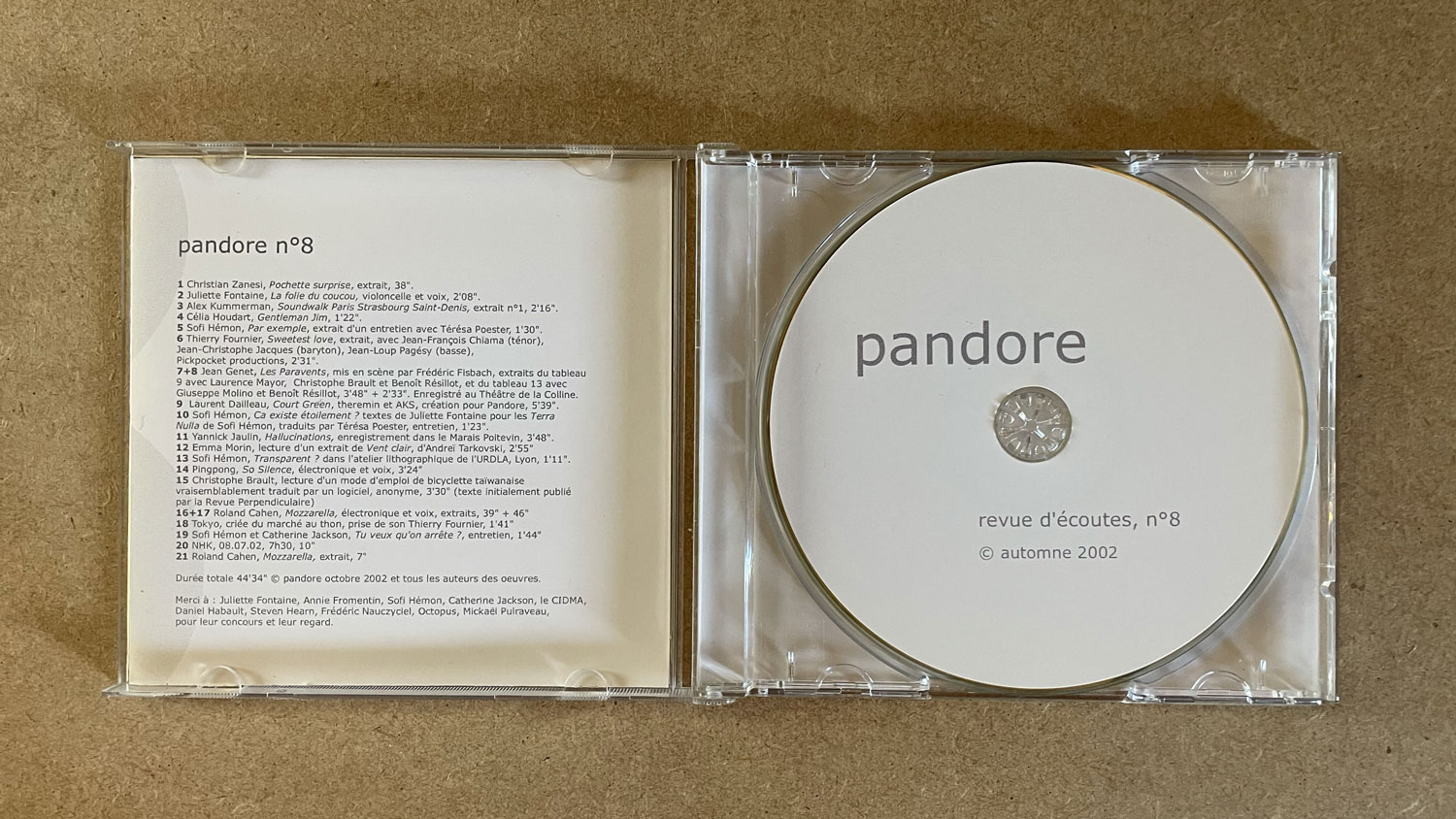 Pandore, revue d’écoutes est une revue sonore dont neuf numéros sont parus entre 1997 et 2004, proposant à des auteurices de toutes disciplines (artistes, scientifiques, metteurs·euses en scène, danseur·euses, acteurs·trices, journalistes…) de livrer un extrait sonore de durée libre témoignant de leur recherche en cours.
