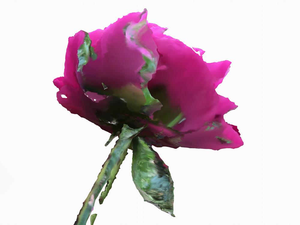 Cependant, l’impossibilité de ce dispositif à restituer tous les détails des fleurs et notamment les zones cachées à l’objectif, génère des manques, que le programme compense en créant des interpolations de forme et de couleur. Un geste d’ordre pictural apparaît alors, dans la signature de l’algorithme et de ses propres limites pour représenter le réel.